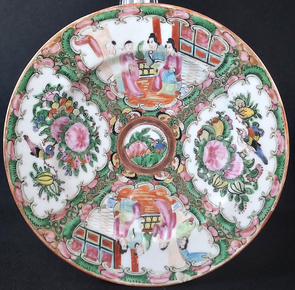 • Antigo prato decorativo em porcelana Chinesa, marcado na base, provavelmente Século XIX, bicado imperceptível na borda (provavelmente ocasionado por suporte de parede), 18 cm de diâmetro.
