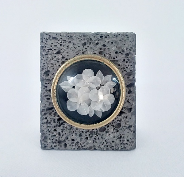 • Peso de papel de origem Portuguesa produzido em bloco de rocha vulcânica natural, com camafeu produzido a mão com escamas de peixe formando flores. Selado na base, em perfeito estado, 8 cm de altura, 7 cm de largura e camafeu protegido por anteparo de vidro com 5 cm de diâmetro.