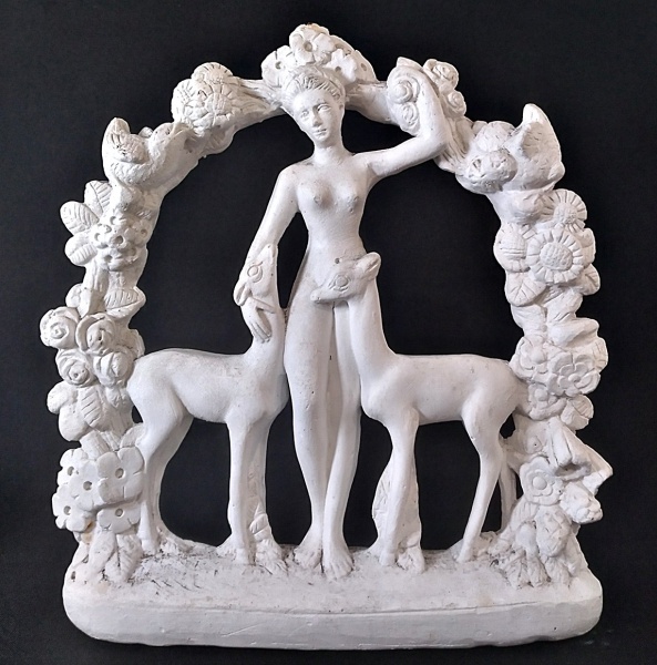 • Interessante grupo escultórico em estuque representando Cariátide de Deusa Grega nua sustentando guirlanda de flores e com veadinhos, 26 cm de altura, 23 cm de largura e 5 cm de profundidade.