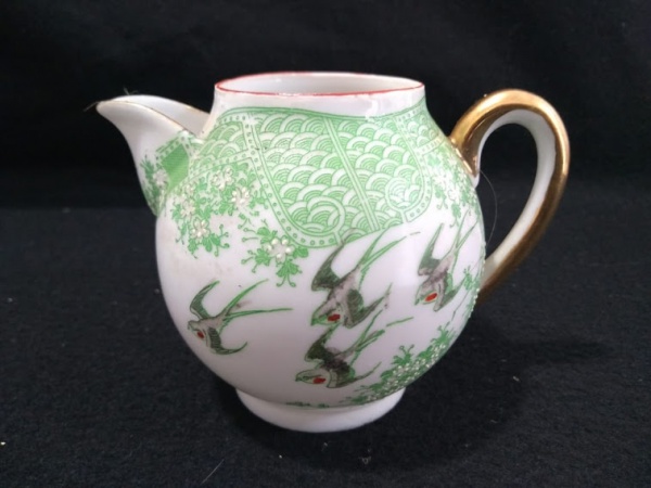 • LINDA E DELICADA CREMEIRA, AO GOSTO CHINÊS, EM FINA PORCELANA CONHECIDA COMO "CASCA DE OVO", PREDOMINANDO AS CORES VERDE, BRANCA E DOURADO, MEDINDO  8 Cm DE ALTURA