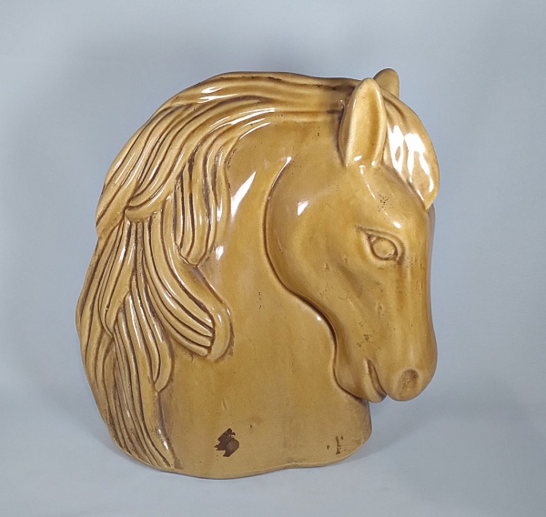 • Grande cabeça de cavalo em faiança vitrificada, provavelmente de origem Portuguesa, em excelente estado, 34 cm de altura, 32 cm de comprimento e 16 cm de largura.