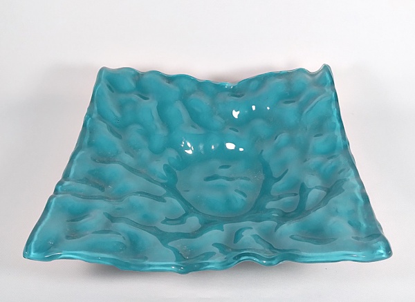 • Diferenciado centro de mesa pintado no verso na cor azul turquesa, com efeito de relevos. Em excelente estado, 24 cm X 24 cm e 7 cm de altura.