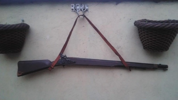 • COLECIONISMO - Antiga Replica de espingarda, utilizada no Mundo Teatral, ( Marcada Mundo Teatral no cabo, vide foto anexa ) toda talhada na madeira,  OBS.: RETIRADA POR CONTA DO ARREMATANTE, NÃO PODERÁ SER ENVIADO PELO CORREIOS.