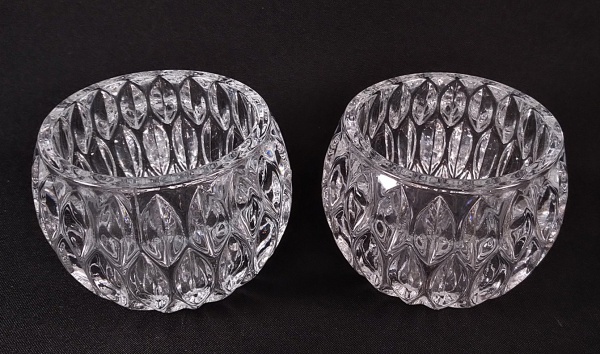 • Par de pequenos vasos bojudos em grosso cristal, lapidados com bisotados em formato de navetes. Em perfeito estado, 7,5 cm de altura e 9,5 cm de diâmetro.