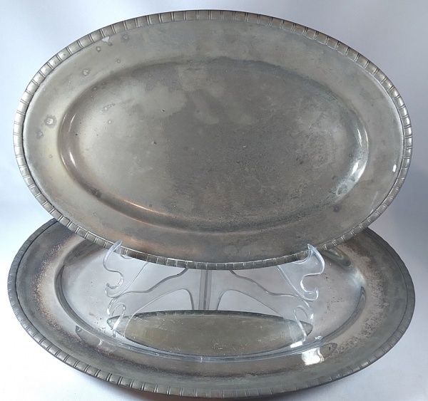 • Par de bandejas ovais em metal espessurado a prata, peças necessitando de polimento, no estado, 42 cm X 30 cm e 37 cm X 26 cm.
