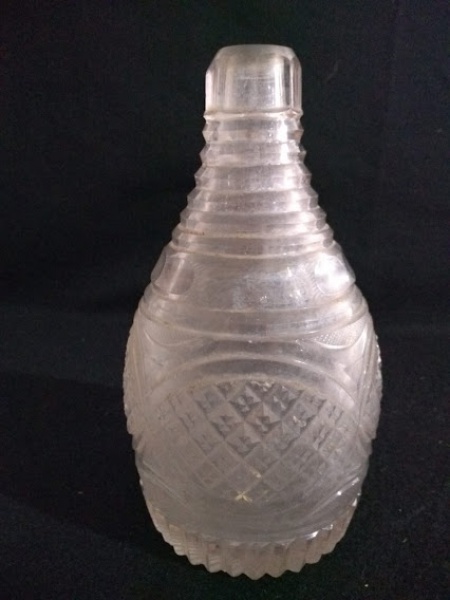 • ANTIGA GARRAFA, EM VIDRO ROSADO, FOSCO, COM ADORNOS EM RELEVO, SEM TAMPA, MED 16 x 9 CM ALT.