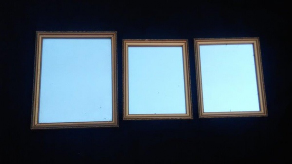 • LOTE COM TRÊS (3) ESPELHOS EMOLDURADOS, VIDE DETALHES NAS FOTOS, MED 34 x 28 Cm, 28 x 23 Cm e 28 x 23 Cm.